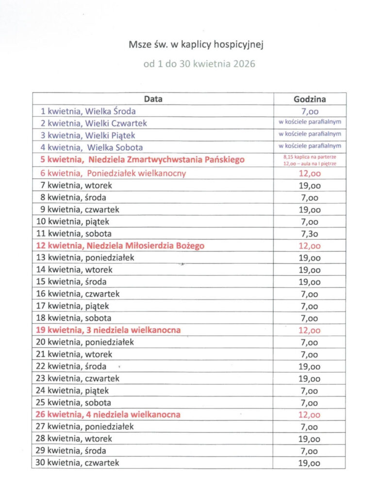 Harmonogram Mszy Św.By Ewelina P|2026-04-04T09:40:22+02:005 marca, 2026|Opieka duszpasterska|Msze Św. 04/2026