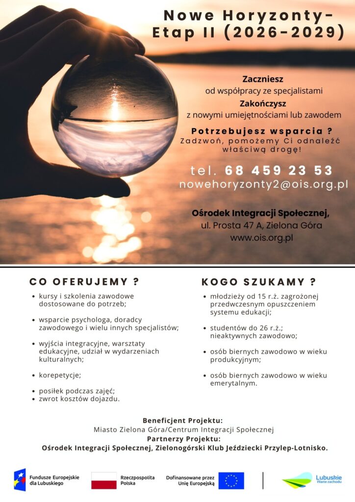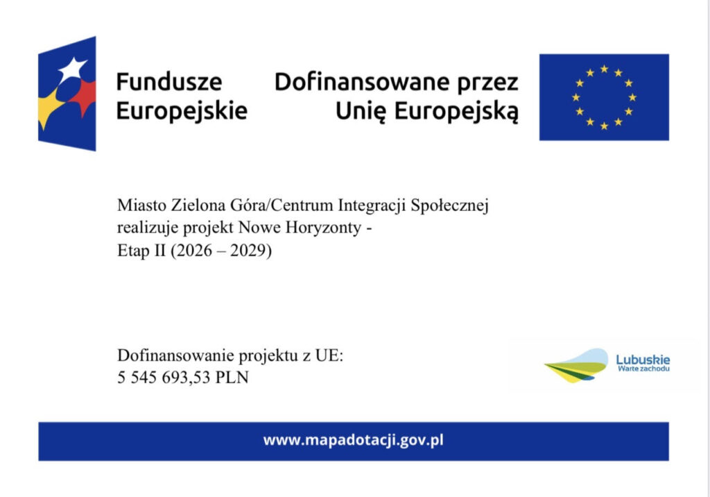 Miasto Zielona Góra realizuje od 01.01.2026 r. do 31.12.2029 r. projekt „Nowe horyzonty – etap II (2026-2029)”, współfinansowany z Europejskiego Funduszu Społecznego Plus w ramach: Programu Fundusze Europejskie dla Lubuskiego 2021 – 2027 w ramach: Priorytetu 6. Fundusze Europejskie na wsparcie obywateli
